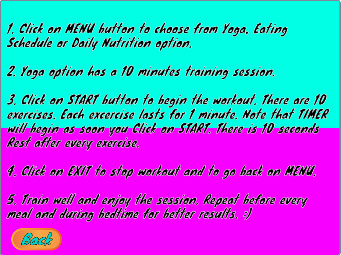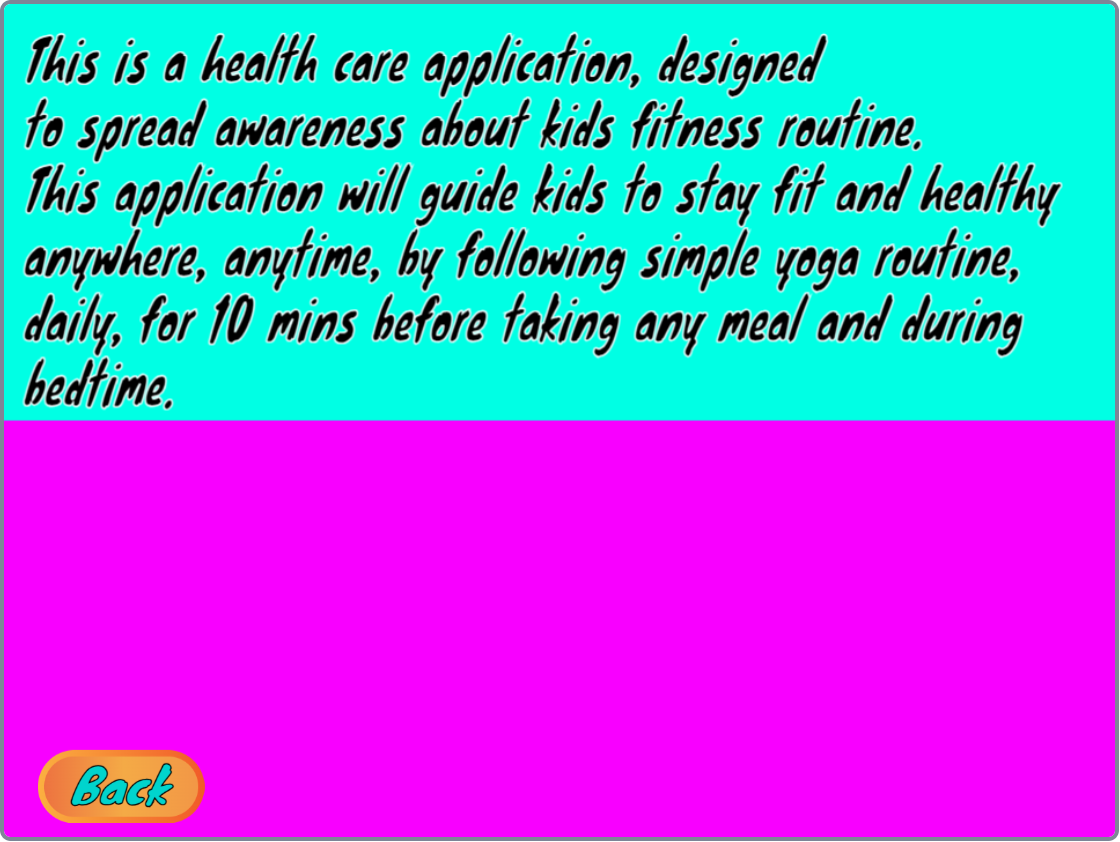 This is a health care application, designed to spread awareness about kids fitness routine. This application will guide kids to stay fit and healthy anywhere, anytime, by following simple yoga routine, daily, for 10 mins before taking any meal and during bedtime.